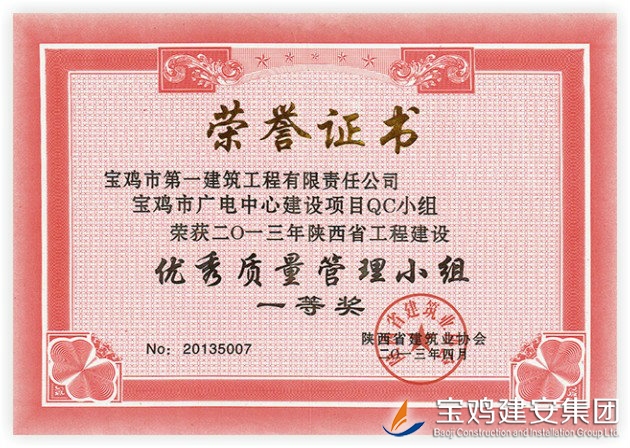 QC Team Award of Baoji Broadcasting Center Project