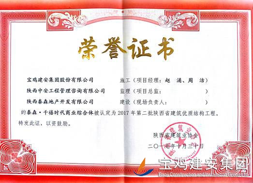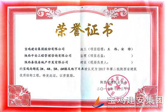 2018年1月26日從陜西省建筑業(yè)協(xié)會(huì)傳來(lái)喜訊,由寶雞建安集團(tuán)股份有限公司負(fù)責(zé)施工的“科技研發(fā)樓工程”(五項(xiàng)目部)、“泰森?千禧時(shí)代商業(yè)綜合體”(六項(xiàng)目部)、“寶雞尚錦苑1#、2#樓”、“寶雞尚錦苑3#、4#、5#、6#樓及地下車(chē)庫(kù)”及“太白縣城市綜合體項(xiàng)目—酒店及球館工程”(路橋項(xiàng)目部)被陜西省建筑業(yè)協(xié)會(huì)評(píng)為2017年第二批陜西省優(yōu)質(zhì)結(jié)構(gòu)工程獎(jiǎng)。 通過(guò)本次獲獎(jiǎng),各項(xiàng)目部能夠依據(jù)項(xiàng)目創(chuàng)優(yōu)要求和相關(guān)法律法規(guī)開(kāi)展質(zhì)量創(chuàng)優(yōu)工作,對(duì)現(xiàn)場(chǎng)原材料、檢驗(yàn)批、分部、分項(xiàng)工程及功能性設(shè)施進(jìn)行質(zhì)量管理,做好“三檢”工作,切實(shí)履行了質(zhì)量管理職責(zé)。在施工過(guò)程中,公司加強(qiáng)對(duì)項(xiàng)目實(shí)體質(zhì)量和資料的檢查監(jiān)督,推行質(zhì)量標(biāo)準(zhǔn)化,確保了每一項(xiàng)工程都能順利驗(yàn)收通過(guò)。 希望各項(xiàng)目部在2018年應(yīng)夠繼續(xù)加強(qiáng)現(xiàn)場(chǎng)質(zhì)量意識(shí),提升項(xiàng)目質(zhì)量管理水平。質(zhì)量部也將繼續(xù)總結(jié)獲獎(jiǎng)工程的典型引路和示范作用經(jīng)驗(yàn),強(qiáng)化工程建設(shè)質(zhì)量管理,多出精品,推動(dòng)公司總體水平穩(wěn)步提高。