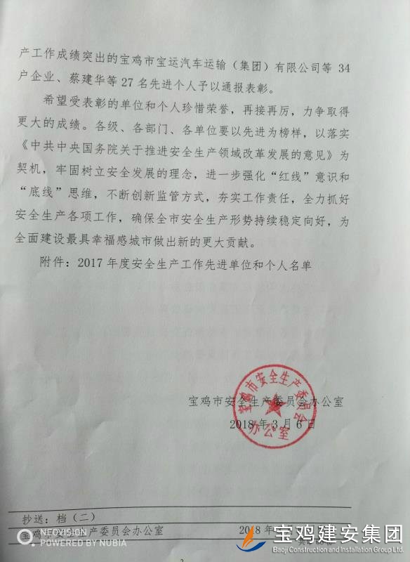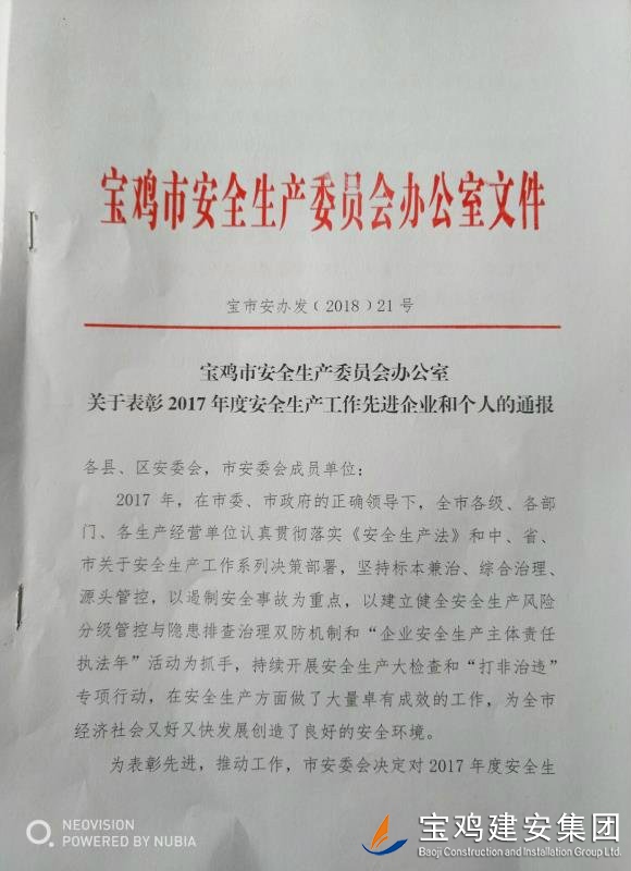 近期,寶雞市安委會(huì)對(duì)2017年度安全生產(chǎn)先進(jìn)單位進(jìn)行了通報(bào),我單位在考核中以優(yōu)異的成績(jī)獲得了此項(xiàng)殊榮。當(dāng)然,取得這樣的成績(jī),離不開(kāi)各級(jí)領(lǐng)導(dǎo)的正確決策和基層單位的艱辛付出,公司安委會(huì)在此表示感謝。