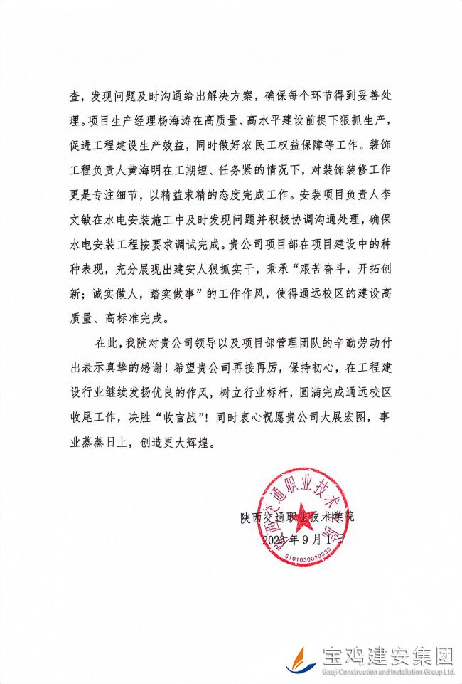 據(jù)悉,陜西交通職業(yè)技術(shù)學(xué)院新校區(qū)一期建設(shè)項(xiàng)目【EPC】一標(biāo)段建筑面積為48200.59平方米,工程造價3.4億。合同工期為2021年11月25日至2023年7月7日總工期600天,實(shí)際開工日期為2022年5月4日,經(jīng)過一年多的施工,現(xiàn)已完成教學(xué)樓和室外工程全部施工內(nèi)容,并于2023年9月1日正式投入使用。